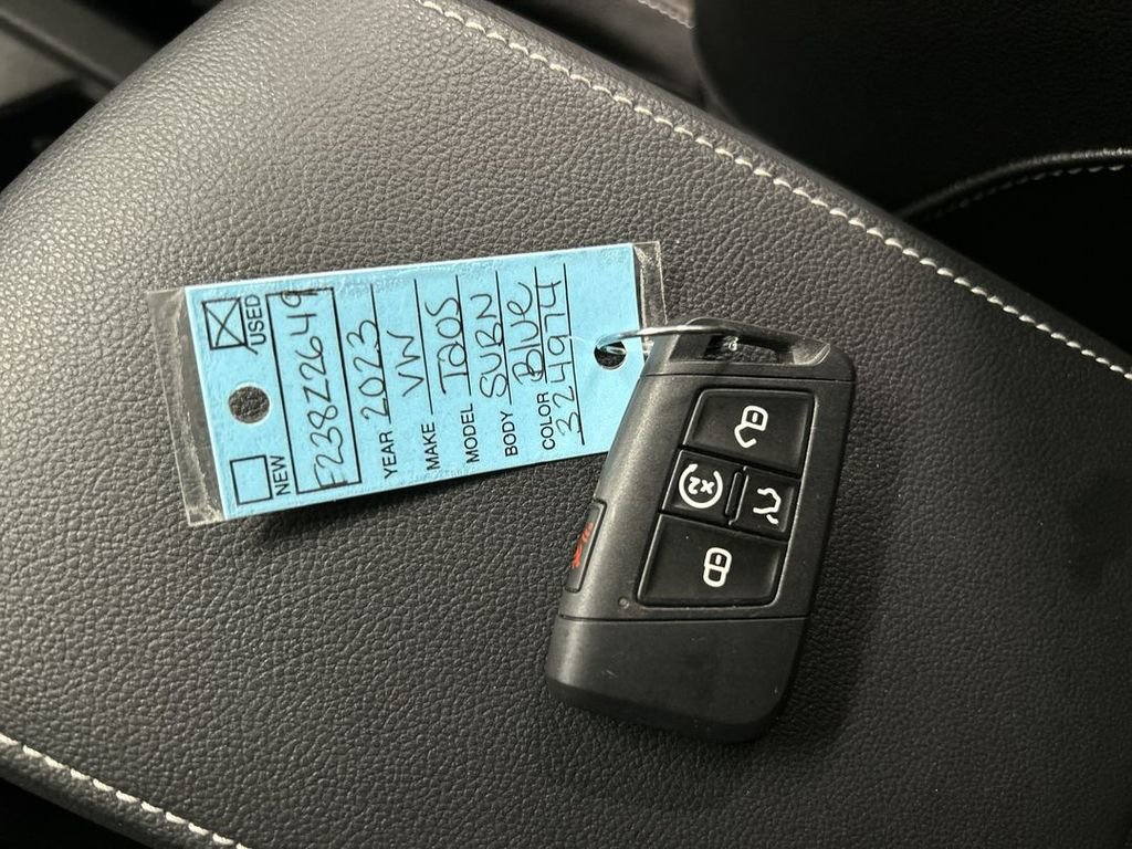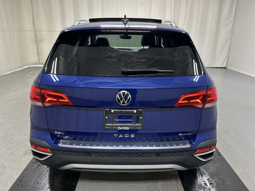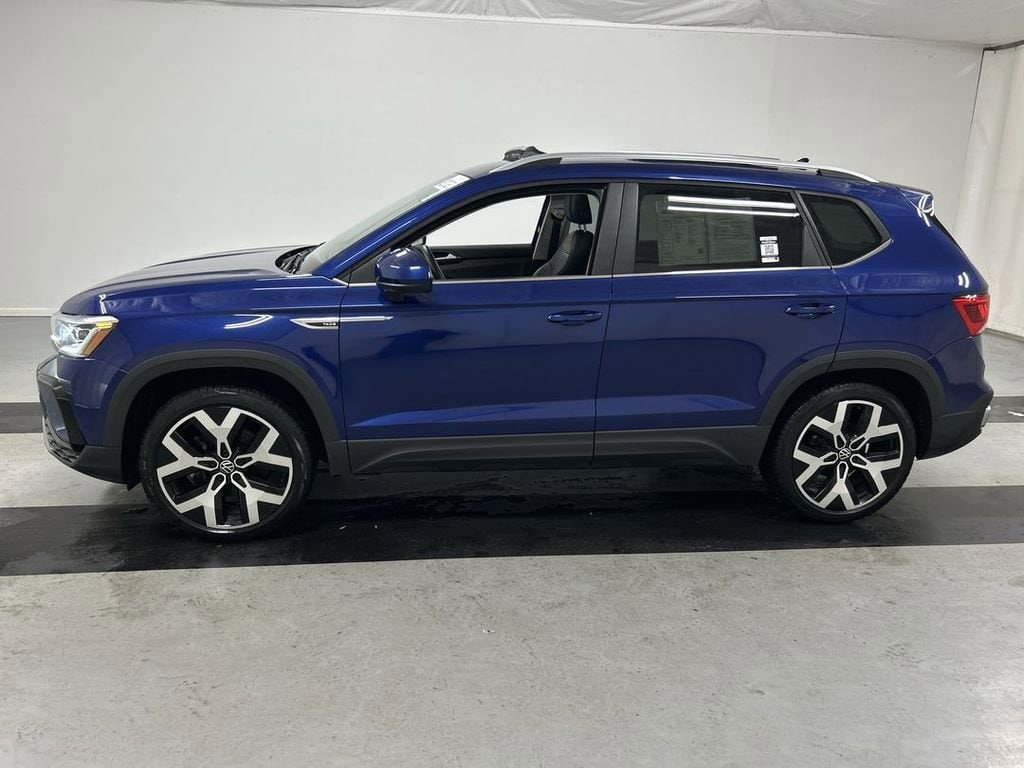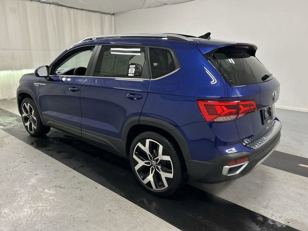 Certified. Blue Metallic 2023 Volkswagen Taos 1.5T SEL AWD 7-Speed DSG Automatic with Tiptronic 1.5L I4 Turbocharged DOHC 16V LEV3-SULEV30 158hp **One owner vehicle**, **LOW miles**, **VW Certified**, Heated front seats, Navigation system: VW Car-Net Guide & Inform, Power moonroof.